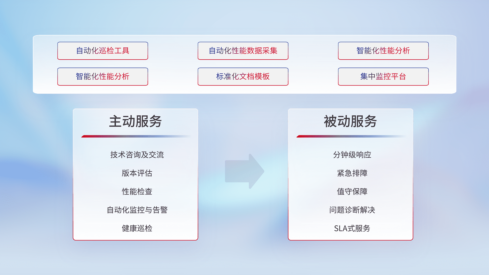 智能化工具和标准化文档,,,保障服务质量,,,,提供主动服务(包含技术咨询、、、、版本评估、、、、性能检查、、自动化监控与告警、、、、健康巡检)和被动服务包含(分钟级响应、、紧急排障、、、、值守保障、、、、问题诊断解决、、SLA服务)。。。。