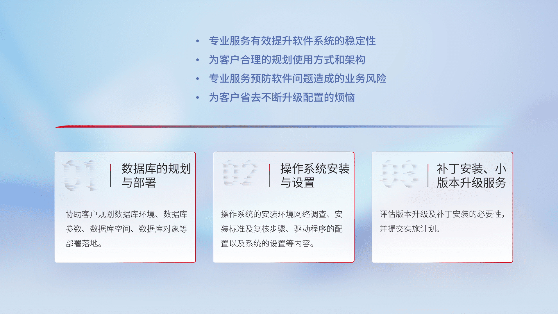 为客户提供软件规模升级、、、快速部署、、、、按需配置的专业服务,,,从数据库的规划与部署到操作系统的安装与设置,,,再到补丁安装和小版本升级提供支持。。。。