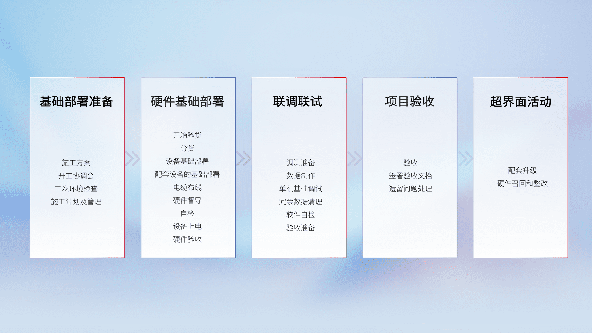 从基础部署准备、、、、硬件基础部署、、、联调联试、、项目验收、、、越界面活动的全过程可追溯,,保证施工质量和进度。。